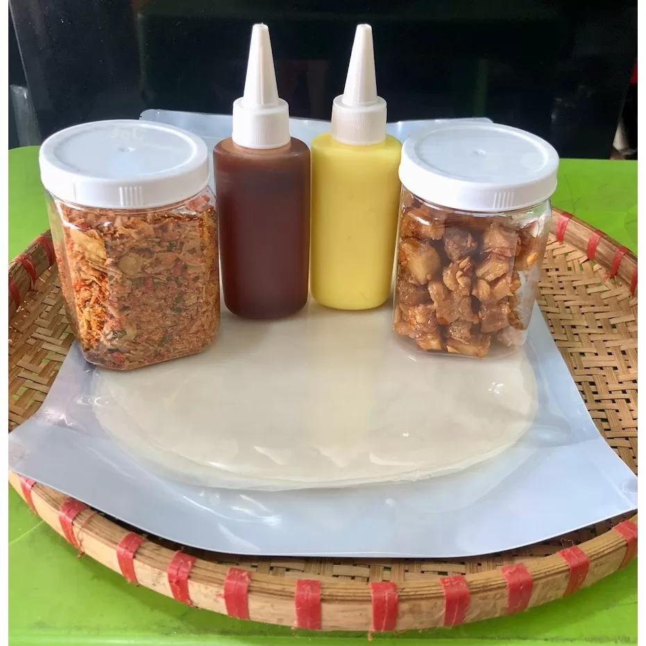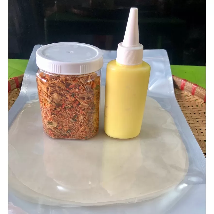 - combo6 :bao gồm 250g bánh tráng phơi sương tây ninh chính gốc, hủ topping muối ruốc hành phi 140g, chai bơ ăn kèm 100ml, chai sốt tắc 100g, hủ tép mỡ da giòn 100g