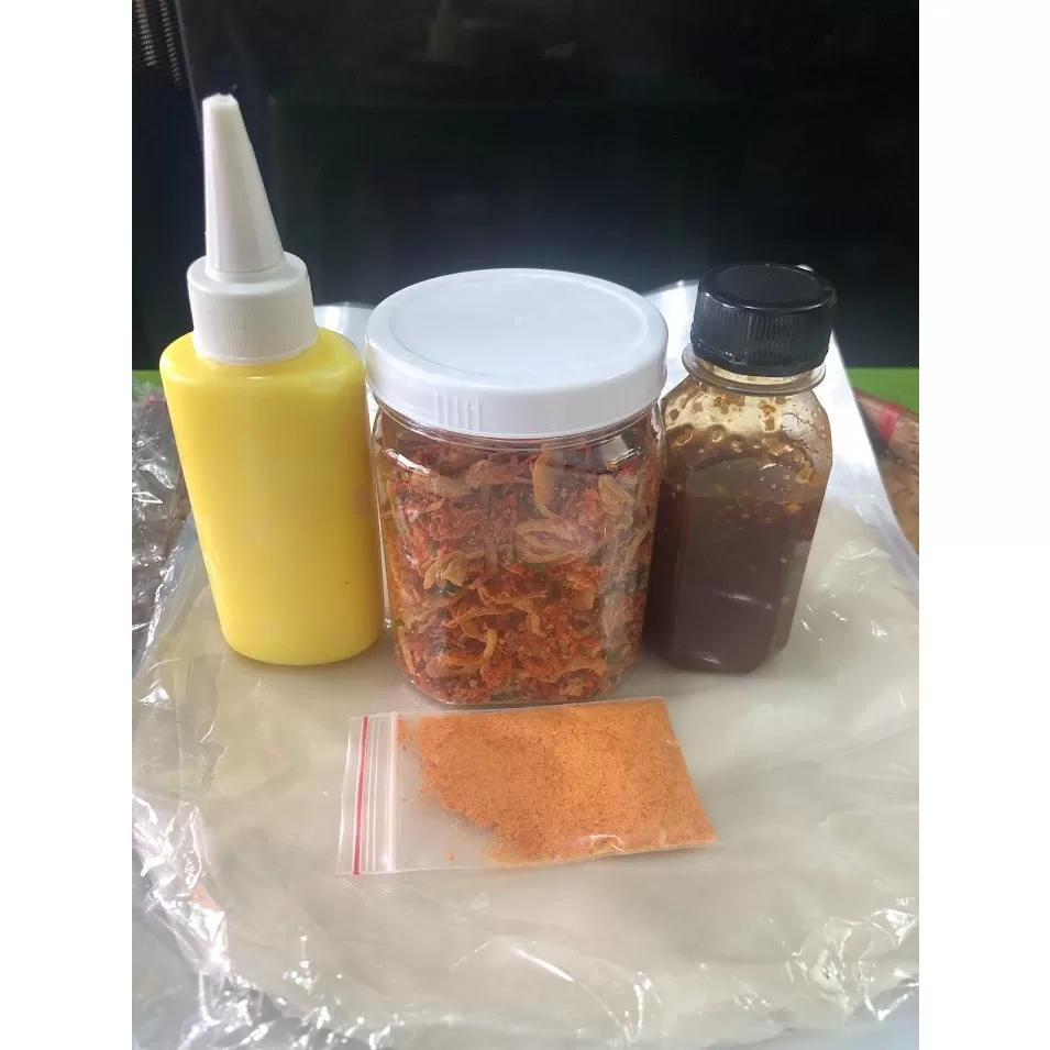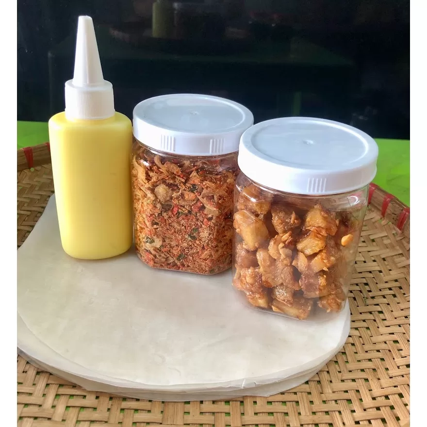 - combo5 :bao gồm 250g bánh tráng phơi sương tây ninh chính gốc, hủ topping muối ruốc hành phi 140g, hủ sốt ớt tươi rim 180g hủ tép mỡ da giòn 100g